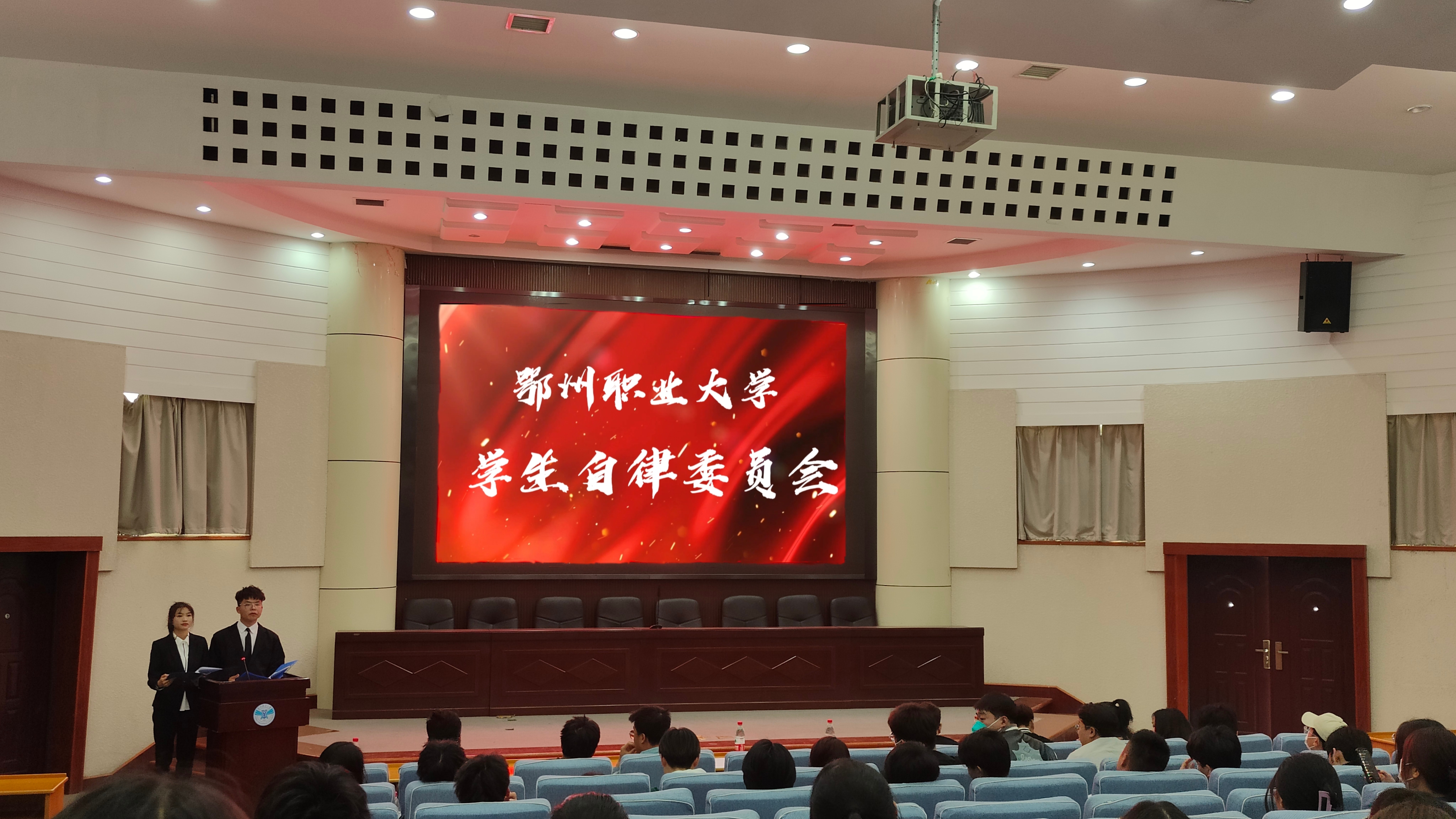 3月31日下午,鄂州职业大学学生自律委员会换届大会在图书馆二楼学术报告厅举行。党委学工部(处)副处长潘世超、园区办洪全洲老师出席会议,学校各级学生组织负责人以及第十五届鄂州职业大学学生自律委员会全体成员参加。会议由史帅恒和黄淋鑫主持。