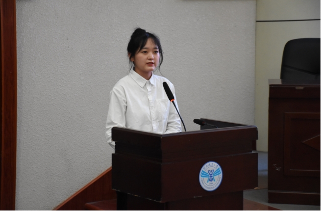 医学院学生代表宋艳珍提出我们应该把握现在,事事尽力,努力营造一个具有温暖友爱,积极向上的新时代文明寝室。