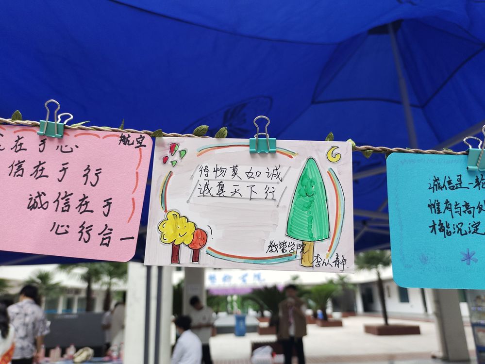 “DIY诚信明信片”设计是本次活动最大的亮点,同学们拿起五颜六色的卡片,将自己的诚信理念用“独特”的方式传达,将诚信精神刻画得惟妙惟肖,五颜六色的明信片悬挂在活动现场,成为了一道靓丽的风景线。