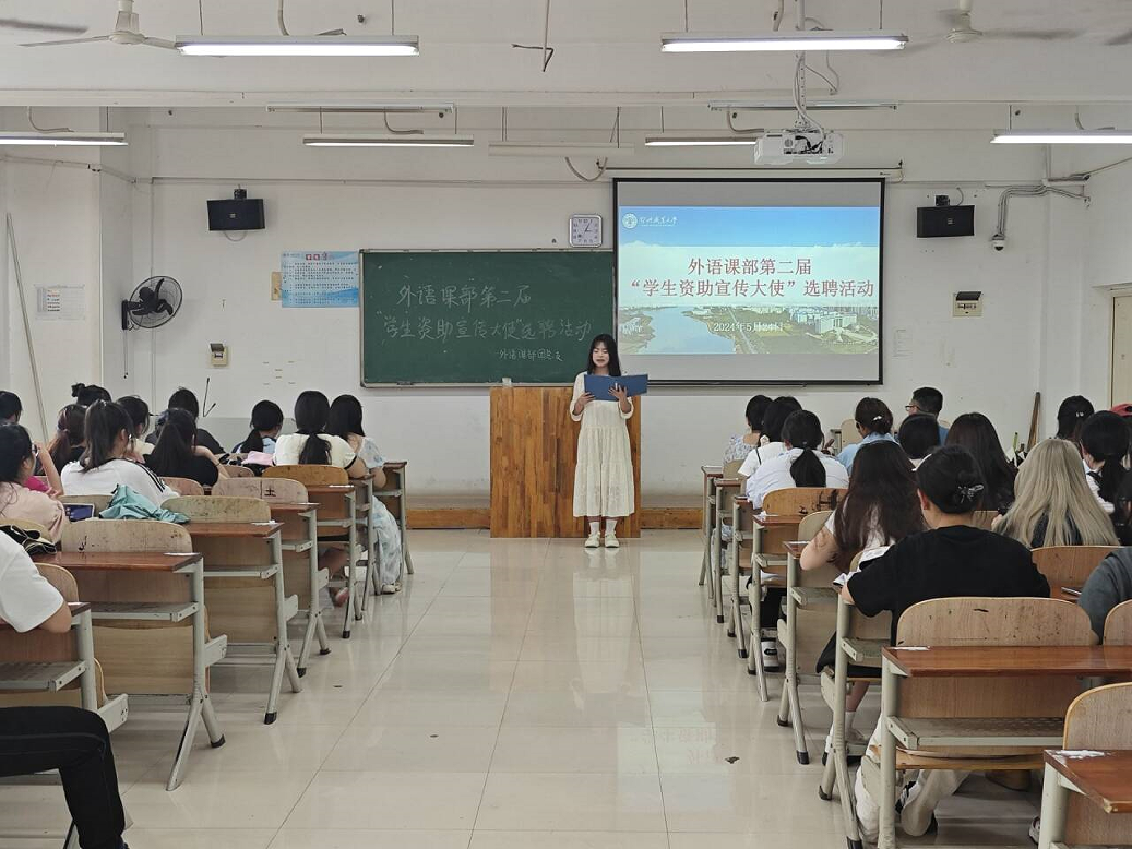 外语课部开展第二届“学生资助宣传大使”选聘活动,经过精彩的演讲竞选环节后,评选出梁敏菲、冯敏妍、郑皓匀三位同学被聘选为外语课部第二届“学生资助宣传大使”。选手们表示将全力以赴投入到资助宣传工作中,为宣传资助政策贡献自己的力量。
