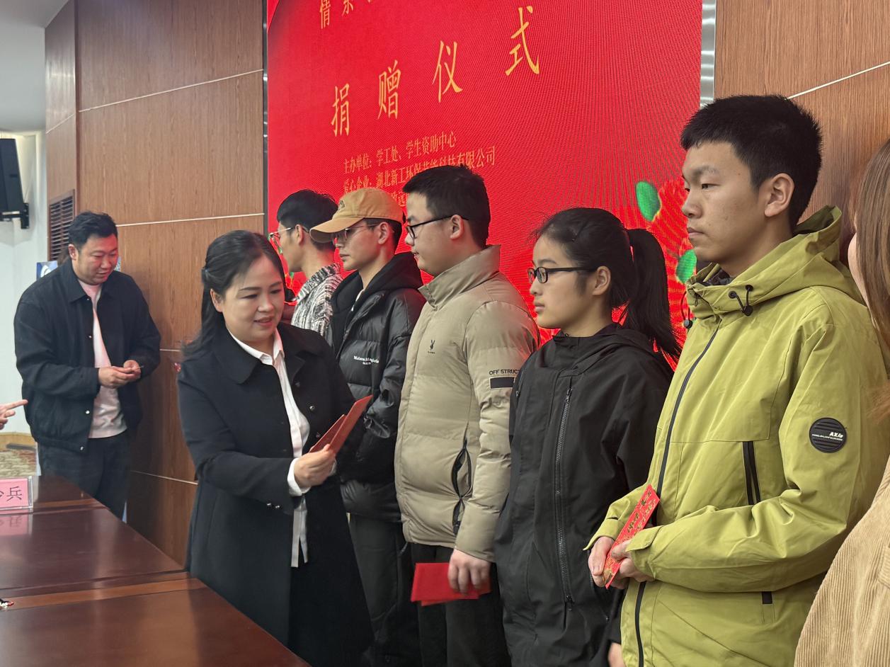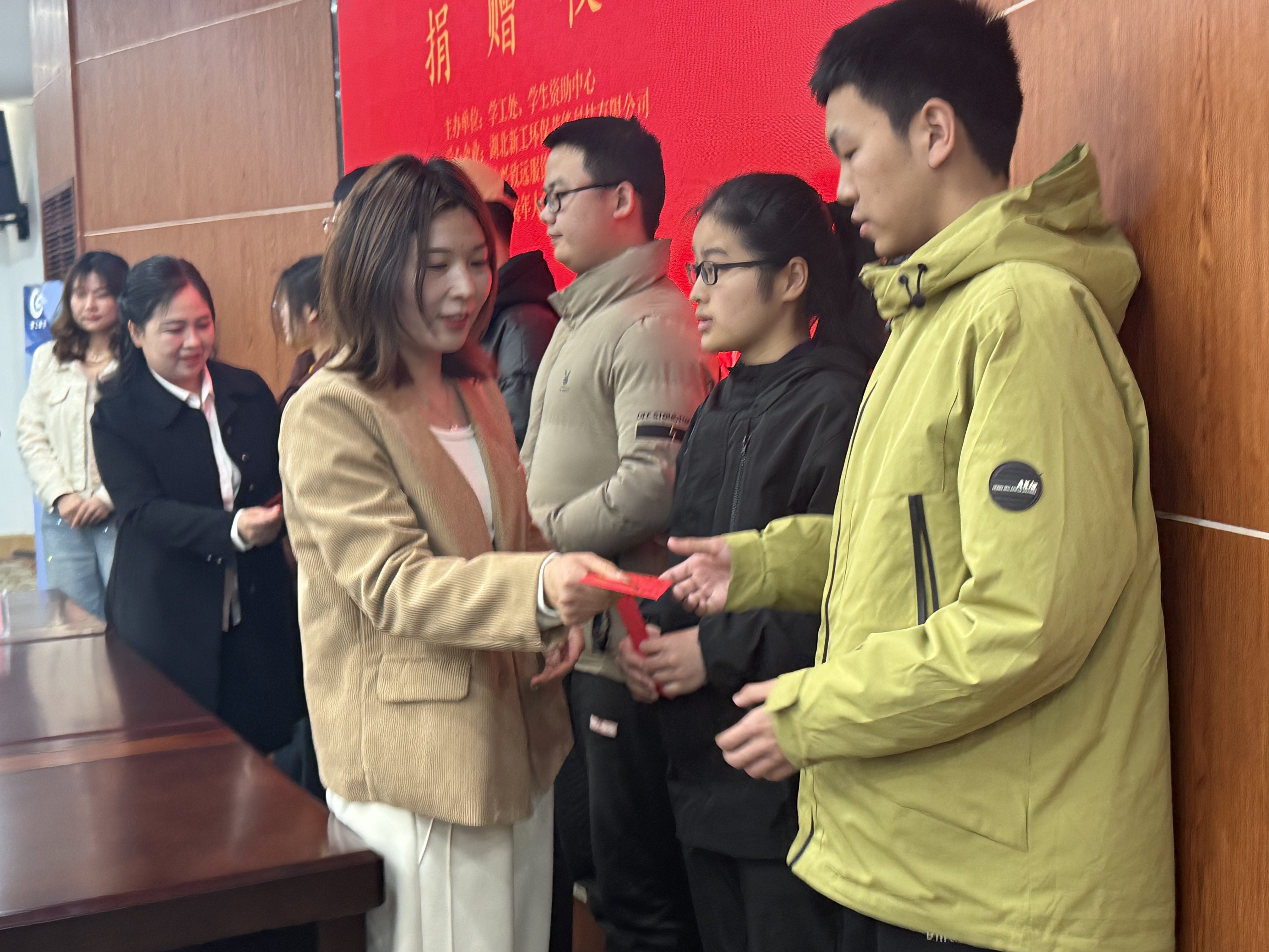在捐赠环节中,湖北新工环保节能科技有限公司、欣兴致远服饰有限公司、鄂州美年大健康向受助学生减免了新生军训服装费用、新生体检费用并发放了热水充值卡