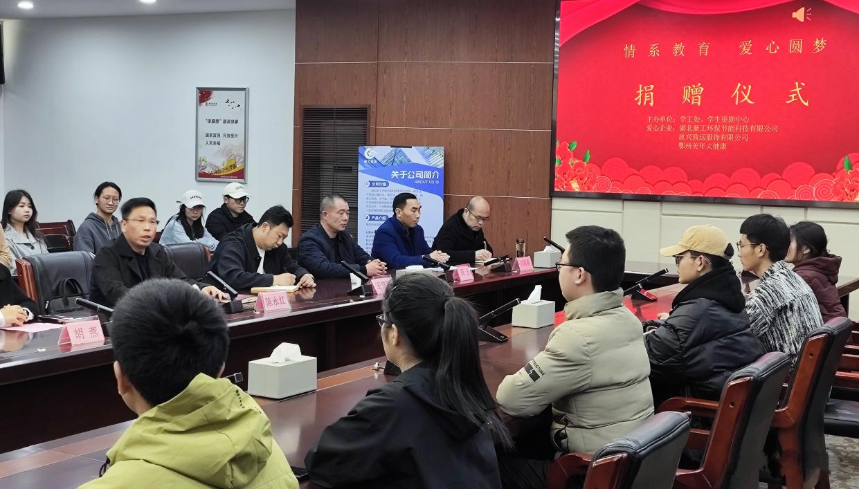 3月20日下午,“情系教育 爱心圆梦”捐赠仪式在校图书馆一楼会议室隆重举行,学工处、后勤基建处、资产处有关负责人、爱心企业湖北新工环保节能科技有限公司、欣兴致远服饰有限公司、鄂州美年大健康有关负责人等参加了仪式。本次活动由学工处主办,旨在通过爱心捐赠帮助我校家庭经济困难学生,传递社会正能量。