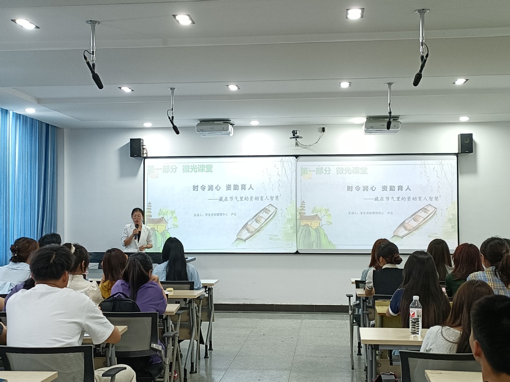 活动以“微光课堂”拉开序幕。此次“微光课堂”由学生资助中心卢玉老师主讲,主题为《藏在节气里的育人智慧》,通过生动的春分知识讲解和多媒体展示,带领同学们重温非物质文化遗产---24节气,解读了春分节气中“阴阳平衡、昼夜平分”的自然哲理。学生们共同吟诵《二十四节气歌》,在韵律中感受先祖“观天察地”的农耕智慧。卢玉老师将春分日传统习俗与学校资助育人内涵相结合,提炼资助工作“经济帮扶--能力提升--精神培育”三位一体的资助育人新模式。课堂通过互动问答和角色扮演,激发学生对传统文化的兴趣,同时也深化了学生们对国家资助政策及资助育人工作内涵的理解。