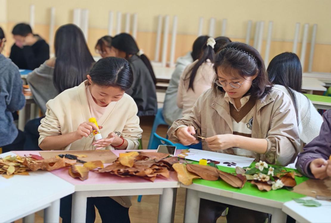 手工创作环节,同学们充分发挥想象力与创造力,将收集到的树叶进行修剪、拼接、粘贴,通过不同颜色、质感的树叶搭配,表达对生活的感悟与对未来的期许。创作过程中,大家相互协作、交流技巧,遇到思路瓶颈时,在老师的引导下重新审视叶片的特性,调整创作方案。指尖翻飞间,原本普通的树叶被赋予了新的生命,一幅幅充满个性的拼贴画逐渐成型,每一幅作品都凝聚着同学们的审美思考与情感表达。