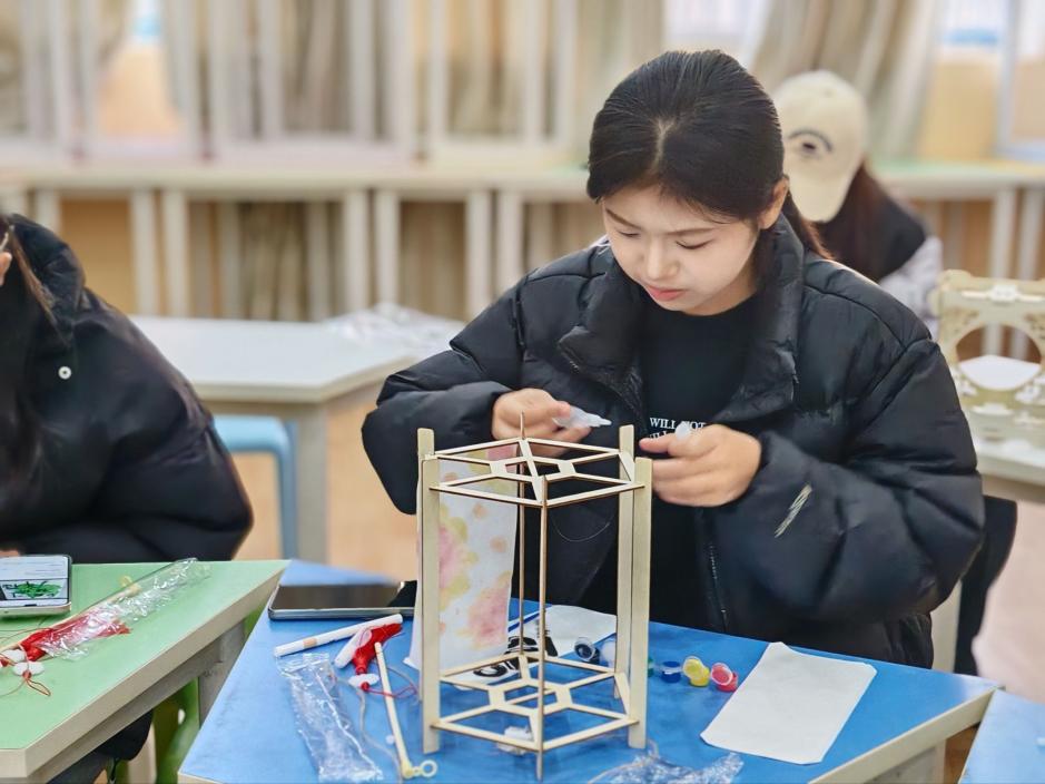 随后,朋辈艺术手工坊正式开启,“花灯寄情·心手相连”主题制作活动让现场氛围愈发温馨。朋辈艺术指导员马丽丽同学为每位学生分发了花灯制作材料包,从竹篾骨架的搭建到彩纸的裁剪粘贴,再到灯穗的装饰点缀,马丽丽同学全程耐心指导,鼓励大家相互协作、分享创意。同学们或专注搭建,或交流技巧,原本零散的材料在一双双巧手中逐渐变成了造型别致的花灯。有的同学在花灯上写下“手足情深”的字样,有的则绘制了苏轼诗词中的经典场景,每一盏花灯都承载着大家对美好情谊的期许。