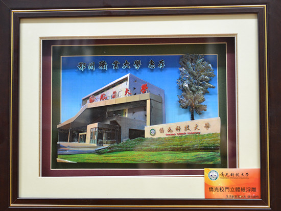 此行是侨光科技大学第三次来访,陈伯涛先生带来了邀请函,热情邀请我校参加侨光科技大学于今年10月举行的50周年校庆活动,并赠送了侨光科技大学的校标以及由生活创意设计系师生制作的作品——侨光校门纸浮雕。