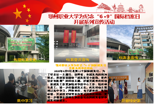 2020年6月9日是第13个国际档案日,为认真贯彻落实党的十九大和2020年“两会”精神,大力营造决胜全面建成小康社会的良好气氛,全面夺取疫情防控和经济社会发展“双胜利”,我校按照省、市档案局的相关通知要求,开展了“档案见证小康路,聚焦扶贫决胜期”为主题的档案宣传学习活动。此次活动主要通过集中学习、网络宣传、电子屏循环播放、悬挂条幅、开放校史馆等多种形式进行,更进一步增强了全校师生和社会公众的档案意识和档案法制观念。