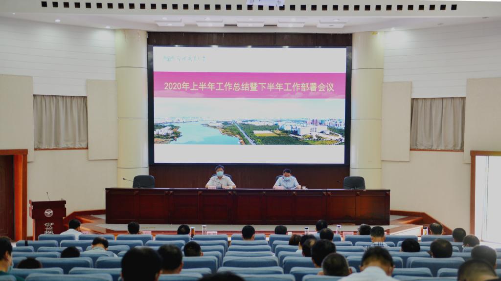 7月29日下午,我校在图书馆二楼会议室召开会议,全面回顾总结2020年上半年工作,安排部署下半年重点任务。校长周峰作总结报告,会议由党委书记万国光主持,党委班子成员、全校中层副职及以上干部参加了会议。
