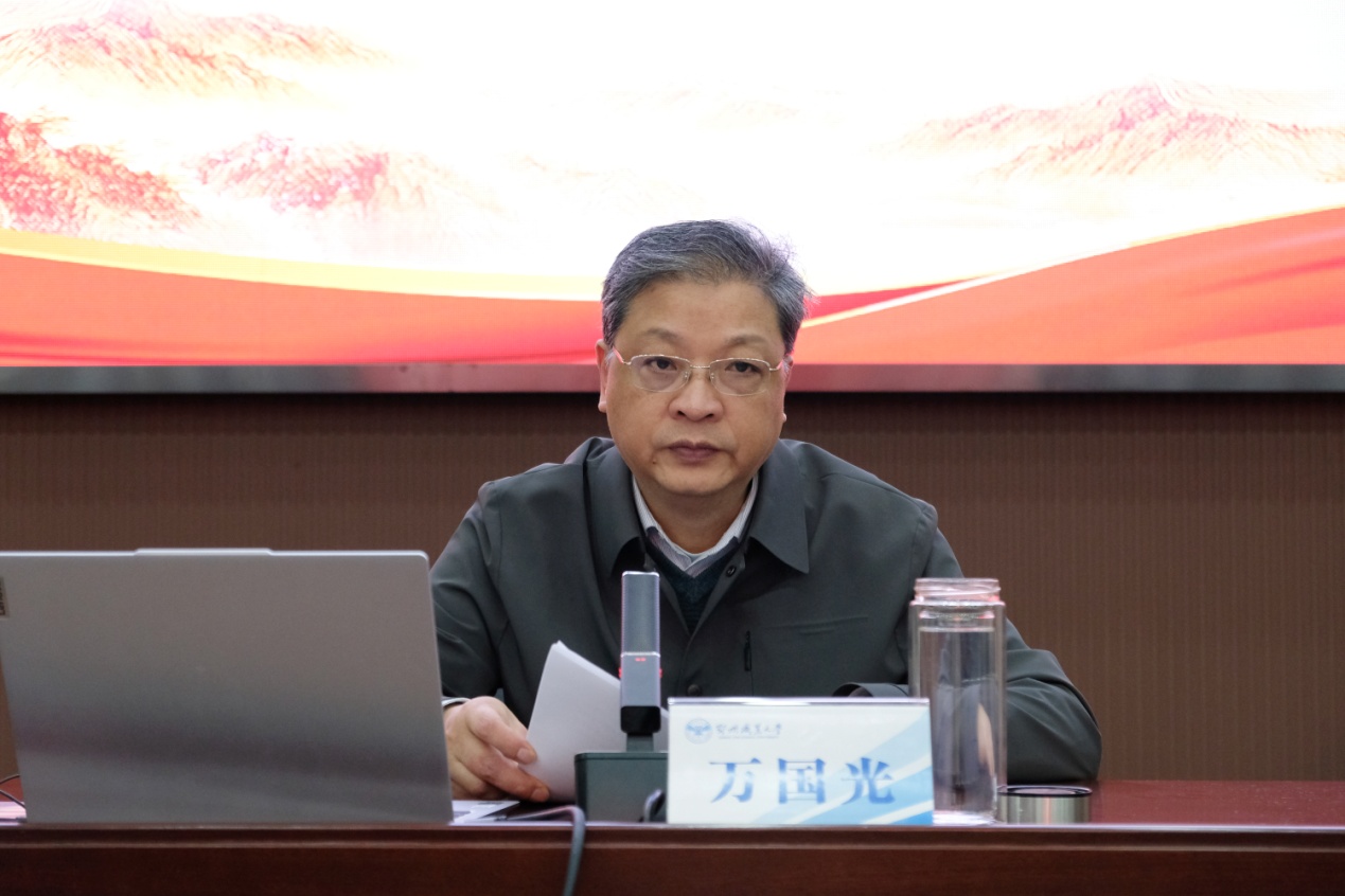 万国光指出,深入贯彻中央八项规定精神学习教育,是党中央作出的重大决策,是推动全面从严治党向纵深发展的有力举措,是密切党群干群关系、巩固党的执政基础的必然要求,也是实现学校高质量发展、服务“两区一枢纽”建设的有力保障。全体党员干部一是要提高政治站位,切实增强开展学习教育的政治自觉、思想自觉、行动自觉。二是要严实标准提质效,准确把握中央八项规定精神实质,充分发挥“关键少数”的表率作用,践行以人民为中心的发展思想,深入推进风腐同查同治,锲而不舍落实中央八项规定不松劲、不停步、再出发。三是要抬高标杆强落实,切实把学习教育融入日常、抓在经常、落在平常;加强组织领导,明确各方工作责任;明确工作安排,一体推进学查改;注重统筹兼顾,全面增强工作实效;以优良党风引领校风学风,让清风正气充盈校园每个角落,为推动学校高质量发展提供坚强政治保障。