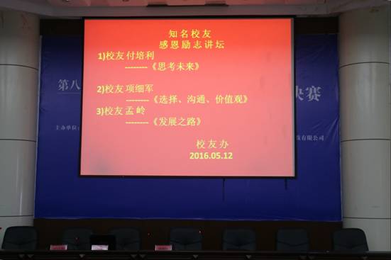 从思考未来出发,讲述人生道理。校友孟岭以“怒放的生命”为切入点,多维度解释职业生涯。校友项细军说:“小赢靠智,大赢靠德;厚德自胜,乐学道成诠释的就是价值观,价值观决定选择”。“生命一次,精彩一生。树立一个长远的目标,为这个目标脚踏实地的坚持,你就能实现梦想”校友付培利兴奋地说到。