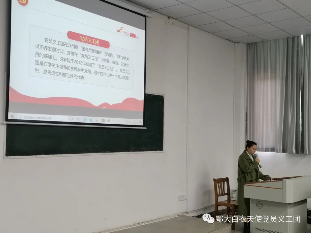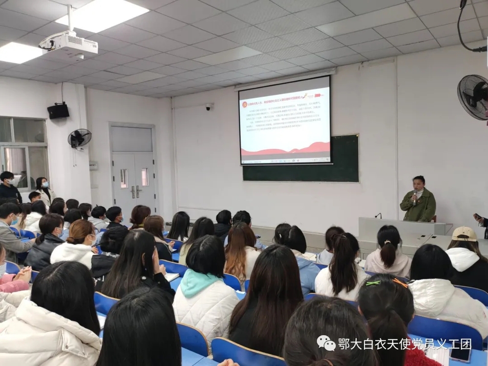 为加强入党积极分子对党的认识,激发青年学生的政治热情,树立正确的理想信念,教育引导学生积极向党组织靠拢,2021年12月4日医学院党员义工团管理老师、疫路引航工作室成员杨柳在医学院阶梯二开展了讲座《让信仰点亮人生》大学生入党启蒙教育。