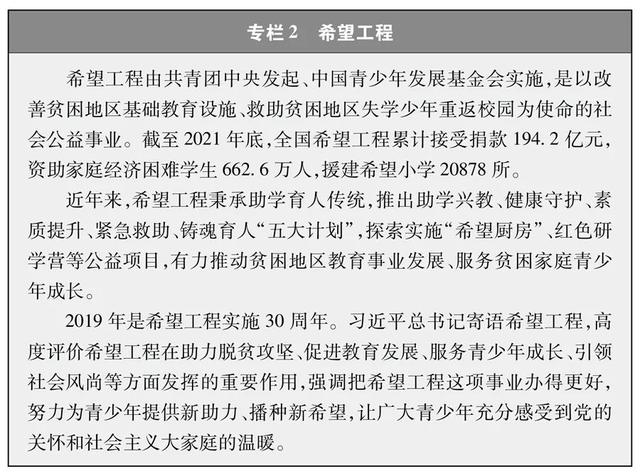 教育机会更加均等。中国教育事业优先发展不断深化,中国青年享有更加平等、更高质量的教育机会。2021年,中国义务教育巩固率达95.4%;高中阶段毛入学率达91.4%;高等教育毛入学率达57.8%、在学总规模达4430万人,居世界第一,越来越多的青年打开了通往成功成才大门的重要路径。覆盖学前教育至研究生教育的学生资助政策体系建成且日趋完善,2020年资助资金总额超过2400亿元、资助学生近1.5亿人次,实现“三个全覆盖”②。义务教育阶段进城务工人员随迁子女、农村和贫困地区学生等群体受教育权益得到充分保障。2020年,85.8%的进城务工人员随迁子女在公办学校就读或享受政府购买学位服务;2012年至2021年,农村和贫困地区重点高校专项招生计划定向招生超过82万人,让更多的青年公平享有接受更好教育的机会,阻断贫困的代际传递。