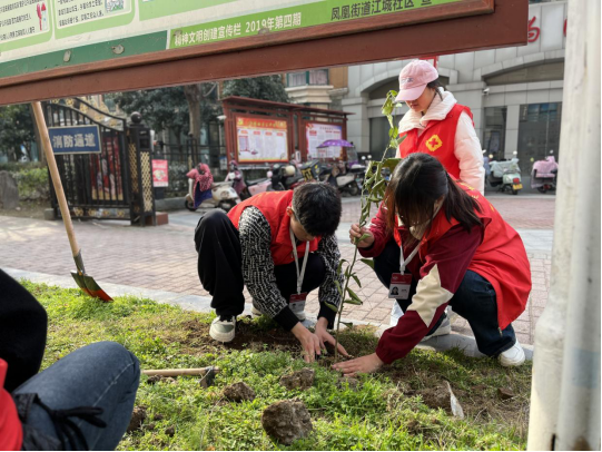 刚到达江城社区植树地点时大家都积极参与,展现出了不同一般的热情。一个个树坑的成型,一棵棵树苗的栽下,象征着一份份绿色希望的茁壮成长;每一滴汗水的流下,每一铲泥土的填充,则代表着每一个人的奉献与爱心。活动的各个环节衔接有序,大家配合默契,每一个环节都认真完成。青年志愿者们充分发扬了团结、互助、友爱的精神,将一颗颗充满生机和希望的树苗植入土里,为繁花似锦的春天增添了一抹新绿。