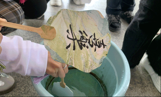 活动现场,同学们亲手调漆,根据自己的心意制作团扇。彩漆漂浮在水面上,将团扇慢慢放入水中扇动,水因势而走,色彩穿插交错随机而成,彩漆随着水流附着在团扇上,流云变幻,尽显诗情画意之感。