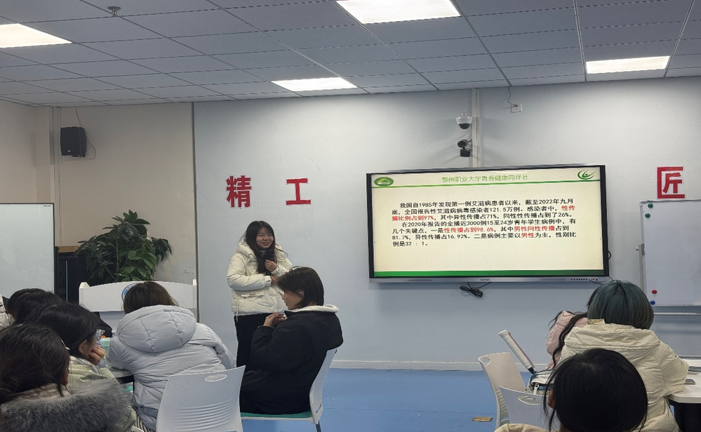 2024年12月18日晚,鄂州职业大学“医路引航”名班主任工作室联合青春健康同伴社在五号楼W702智慧教室举办“青春同行,共抗艾滋”教育活动。此次活动由青春健康同伴社余雅静同学主持。