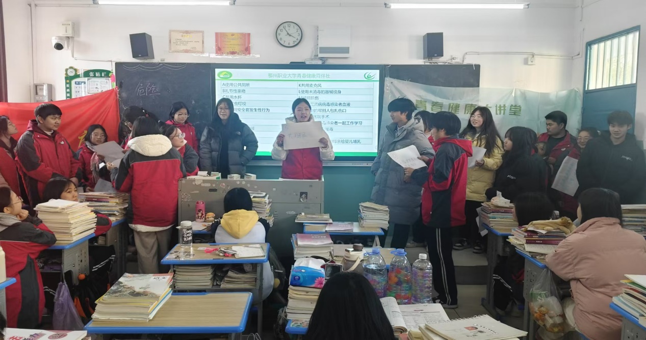 2025年1月8日,马祥媛同学带领当地的青春健康志愿者们在丹江口市汉江科技学校校园中举办了一场主题为“遇艾与爱,你我同在”的生殖健康教育活动。