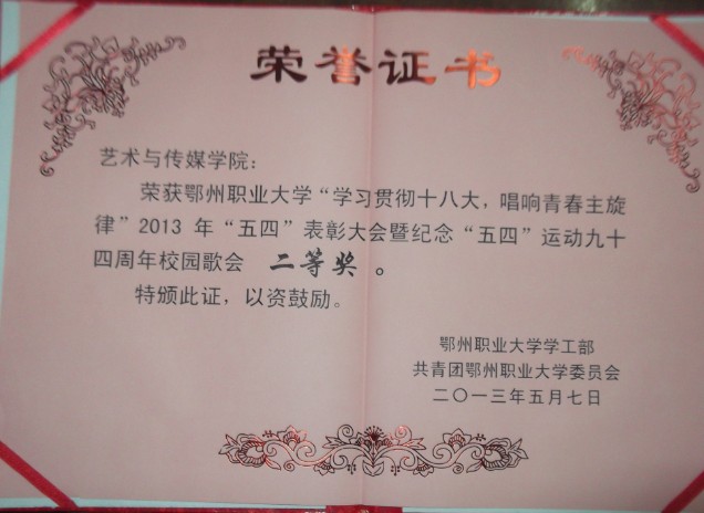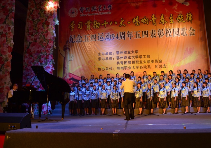 5月6日晚7点整,庆五四运动94周年表彰会暨“学习贯彻十八大 唱响青春主旋律”校园歌会比赛在艺术楼隆重举行,全校各院系共有11支队伍参赛,规模盛大。 此次校园歌会活动得到我院领导高度重视,在精心的组织下历经两个多月的准备和努力,进行了多次彩排,并邀请了多名声乐老师前来指导,我院师生倾情献唱,赢得全场师生的一致喝彩,为本次五四晚会添上了靓丽的一笔,并荣获歌会二等奖。