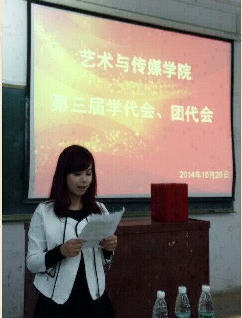 (本网讯记者杨雪)第三届艺术与传媒学院换届大会,在上周日(10月26日)在建工楼E508成功举行。本院系杨婷老师,赵杰主任,叶宏院长出席此活动,来自新闻班的向晓丽担任主持。