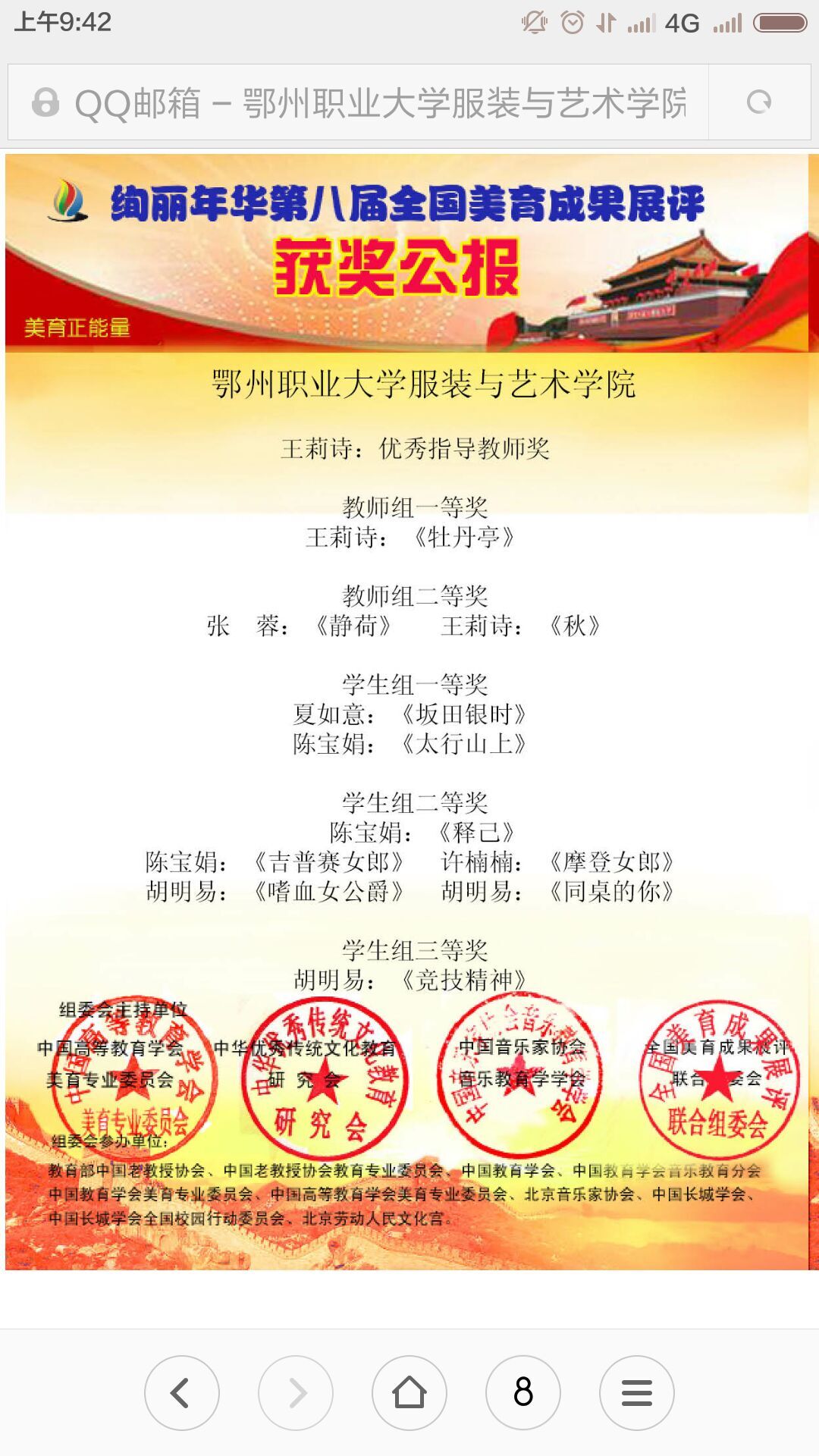 近日,我校服装与艺术学院传来喜讯。我校服装与艺术学院师生在由中华优秀传统文化教育研究会、中国教育学会音乐教育分会、中国高等教育学会美育专业委员会、中国美育网专家文员会、中国紫禁城高端艺术品展览中心、中国长城学会全国校园行动委员会等在中国高等单位主办的“美育正能量·第八届全国美育成果展”评选中,荣获多项国家级奖项。