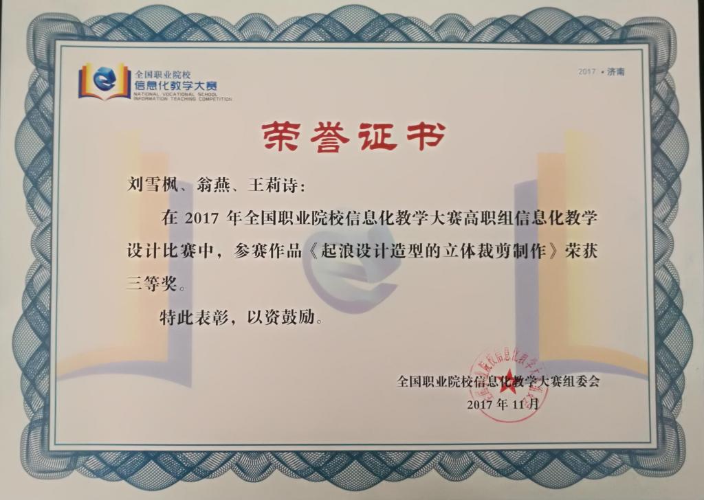 2017年12月我院服装与服饰设计教研室参报的信息化教学设计作品《起浪设计造型的立体裁剪制作》获得全国职业院校信息化比赛三等奖。该赛事是国家教育部主办,高职院校各项比赛中含金量最高的一项赛事。