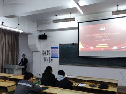 4月18晚7点整,鄂州职业大学服装与艺术学院学院学生干部工作作风建设暨警示教育学习在行知楼召开,大会由院团总支书记姜维老师主持。