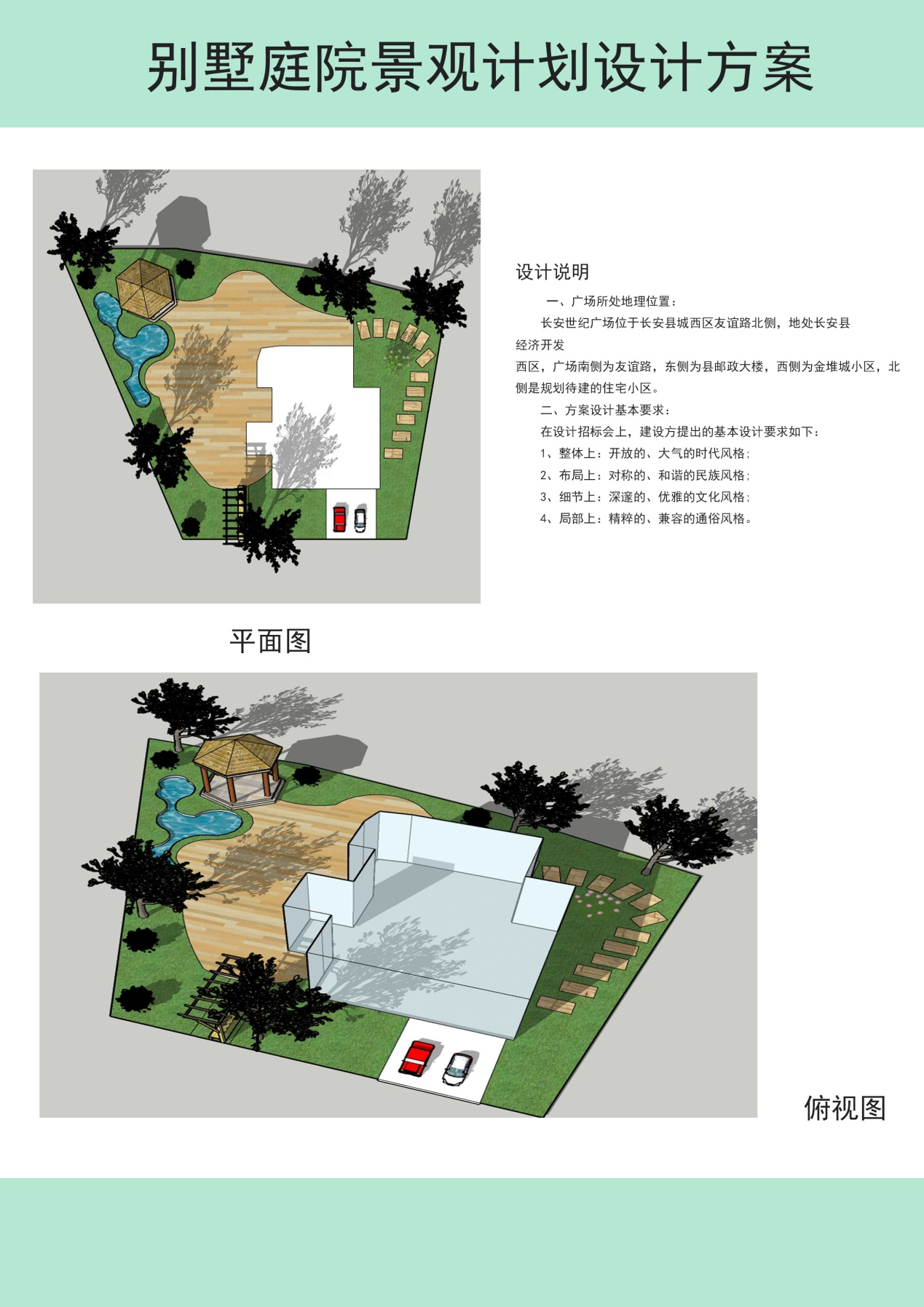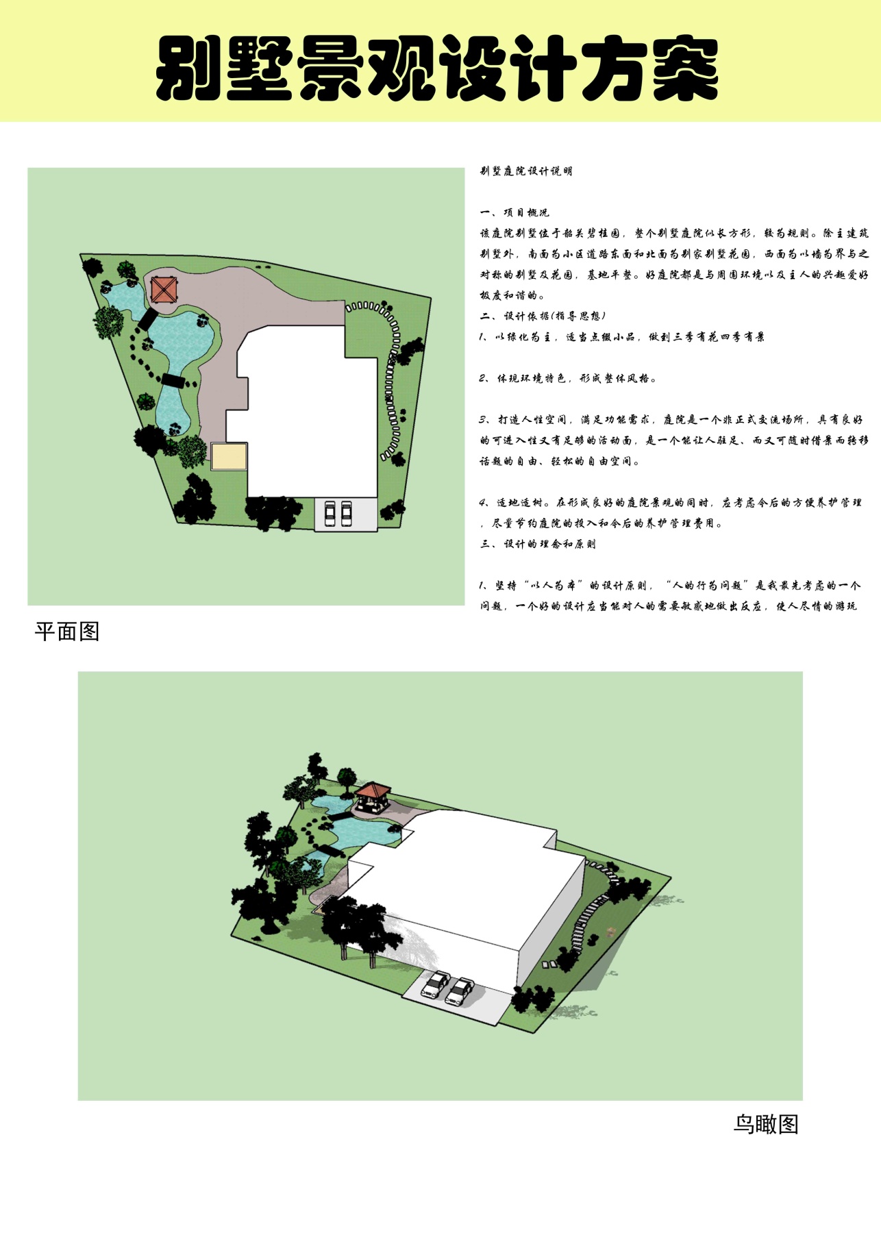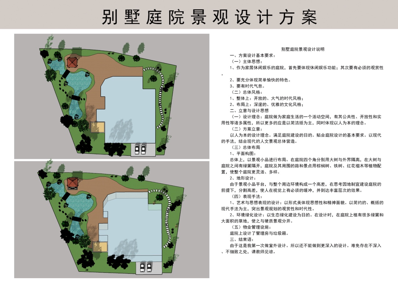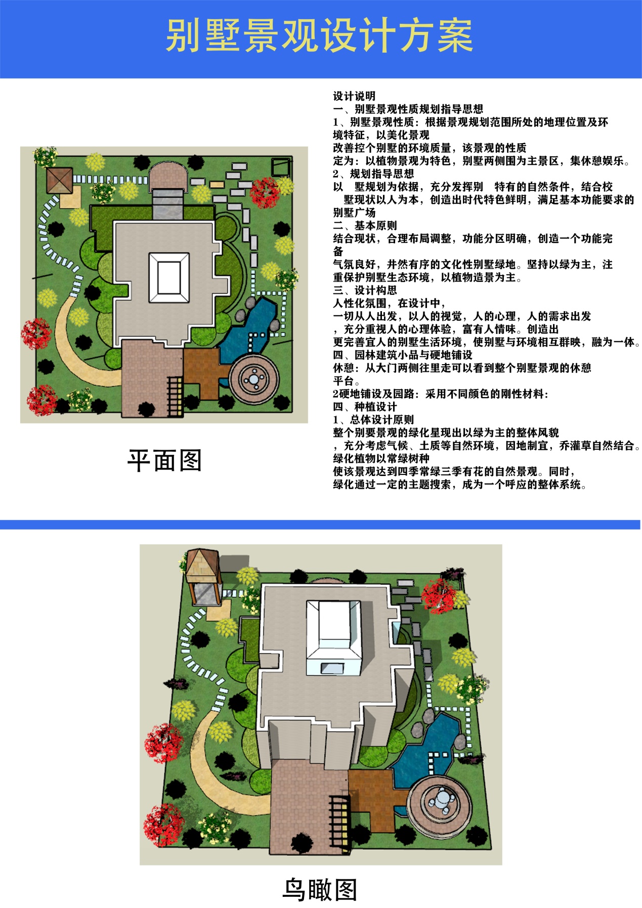 本次作品,需要同学运用Photoshop图像处理软件排版、Sketch up三维模型软件、CAD施工图制作软件三个软件共同操作,完成景观规划设计方案的设计与表现。