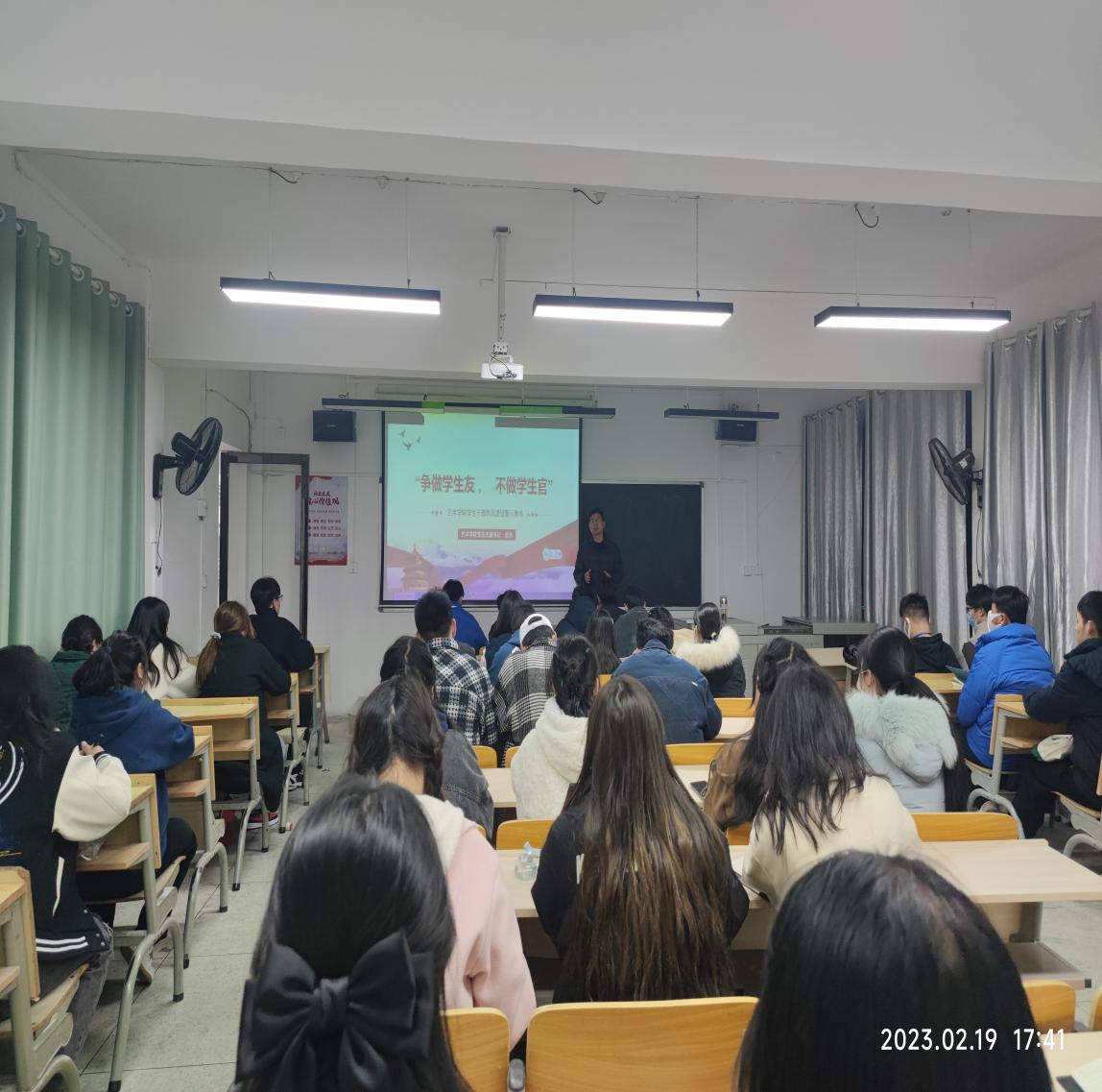 2023年2月19日,艺术学院在三号楼S204教室召开“争做学生友,不做学生官”为主题的学生干部作风建设警示会,会议由学院党总支副书记赵杰主持,学院全体学生干部参加。