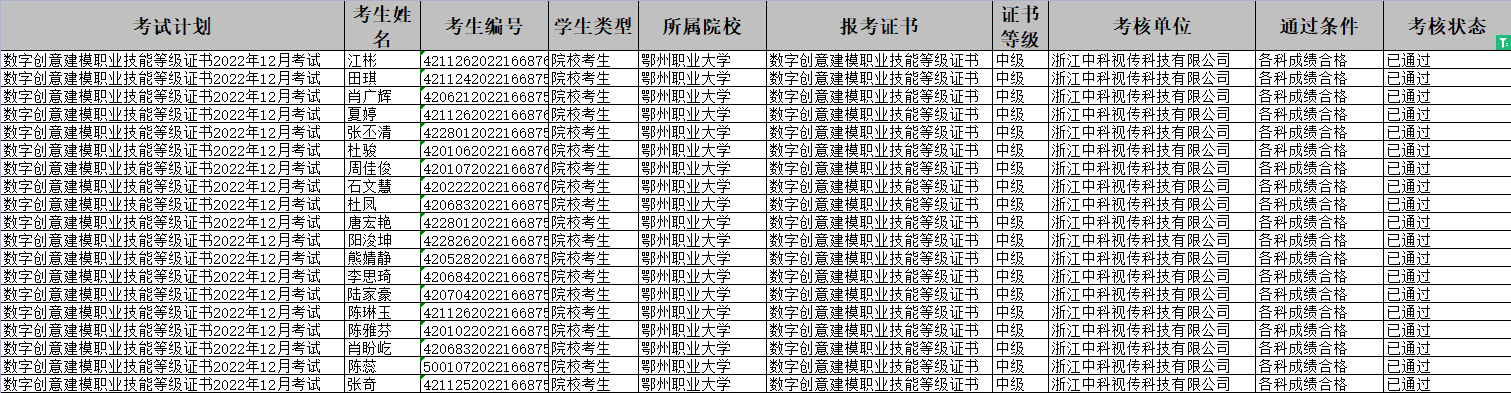 2023年2月24日,“1+X数字创意建模职业技能等级(中级)”考试考核结果公布,我院22名参加此次考核的学生,19人合格,合格率为86%,同时我院艾新春教师获得“优秀教师奖”,我校获得“优秀教学院校”称号。