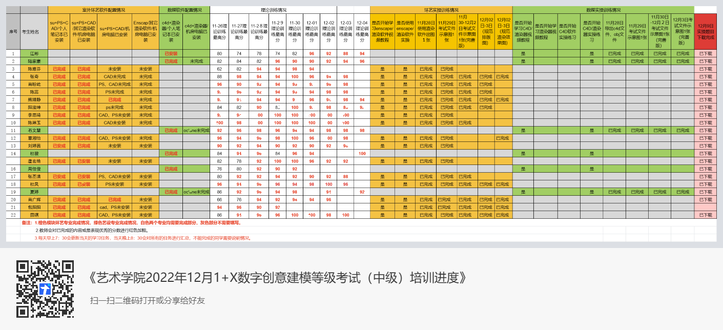 艺术学院为更好地贯彻《国家职业教育改革实施方案》精神,落实《关于在院校实施“学历证书+若干职业技能等级证书”制度试点方案》(教职成〔2019〕6号)要求,在2022年11月底组建教师队伍艾新春、许雪琪、潘璐针对“1+X数字创意建模职业技能等级(中级)”的理论与实操考试核心知识点制定计划并展开线上、线下集中培训。