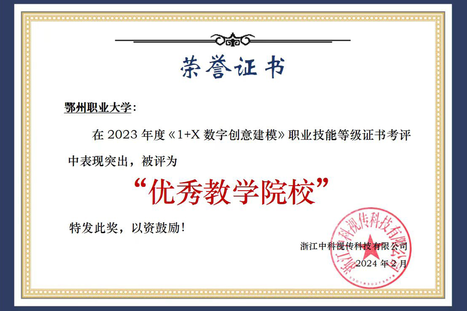 2024年2月,鄂州职业大学荣获2023年“1+X”《数字创意建模》职业技能等级证书考评“优秀教学院校”。艺术学院两名老师获“1+X”《数字创意建模》职业技能等级证书“优秀指导教师奖”。