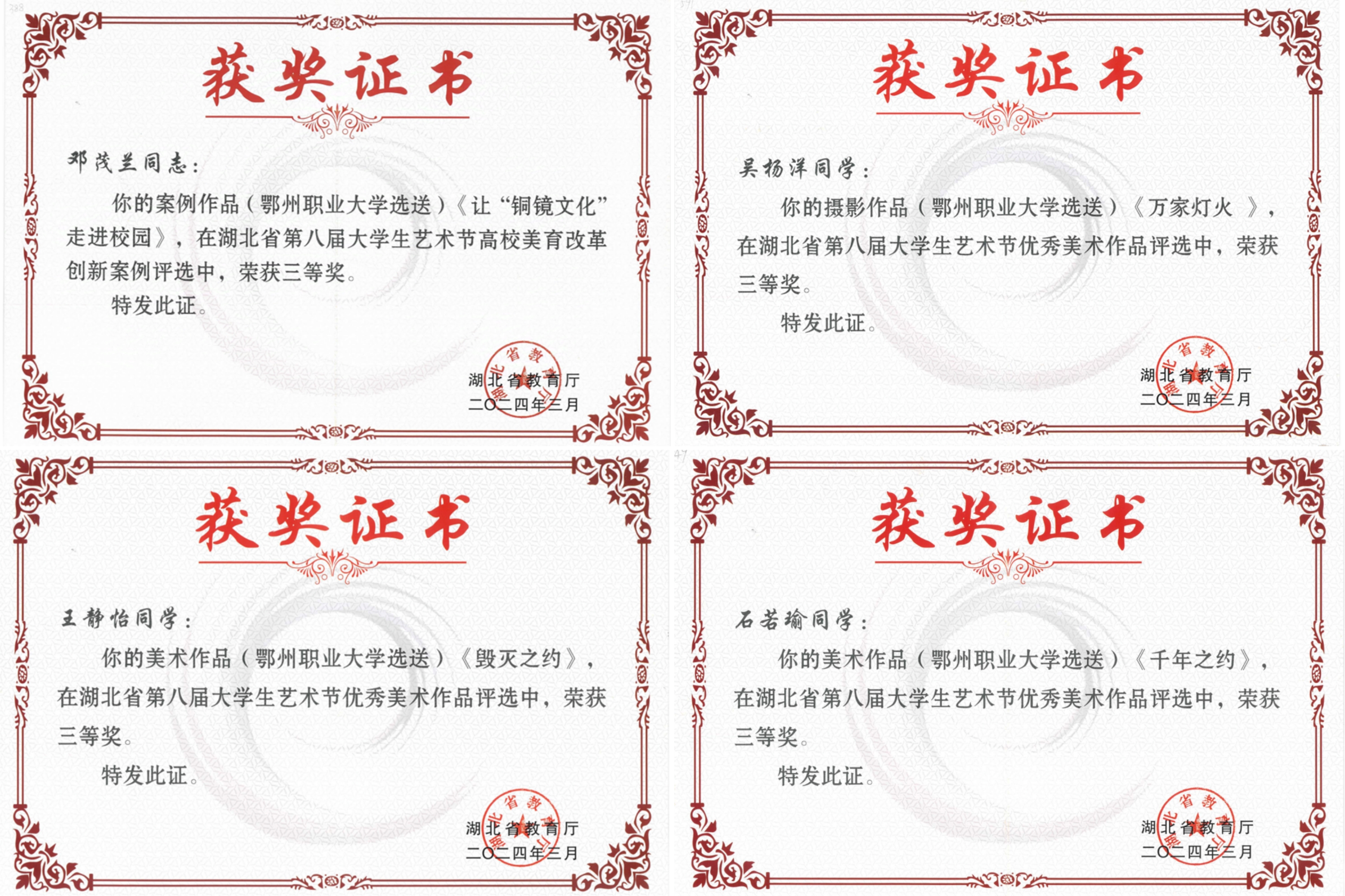 本网讯(通讯员吴丽芳)湖北省第八届大学生艺术节成绩揭晓,艺术学院艺术设计专业师生成绩喜人。