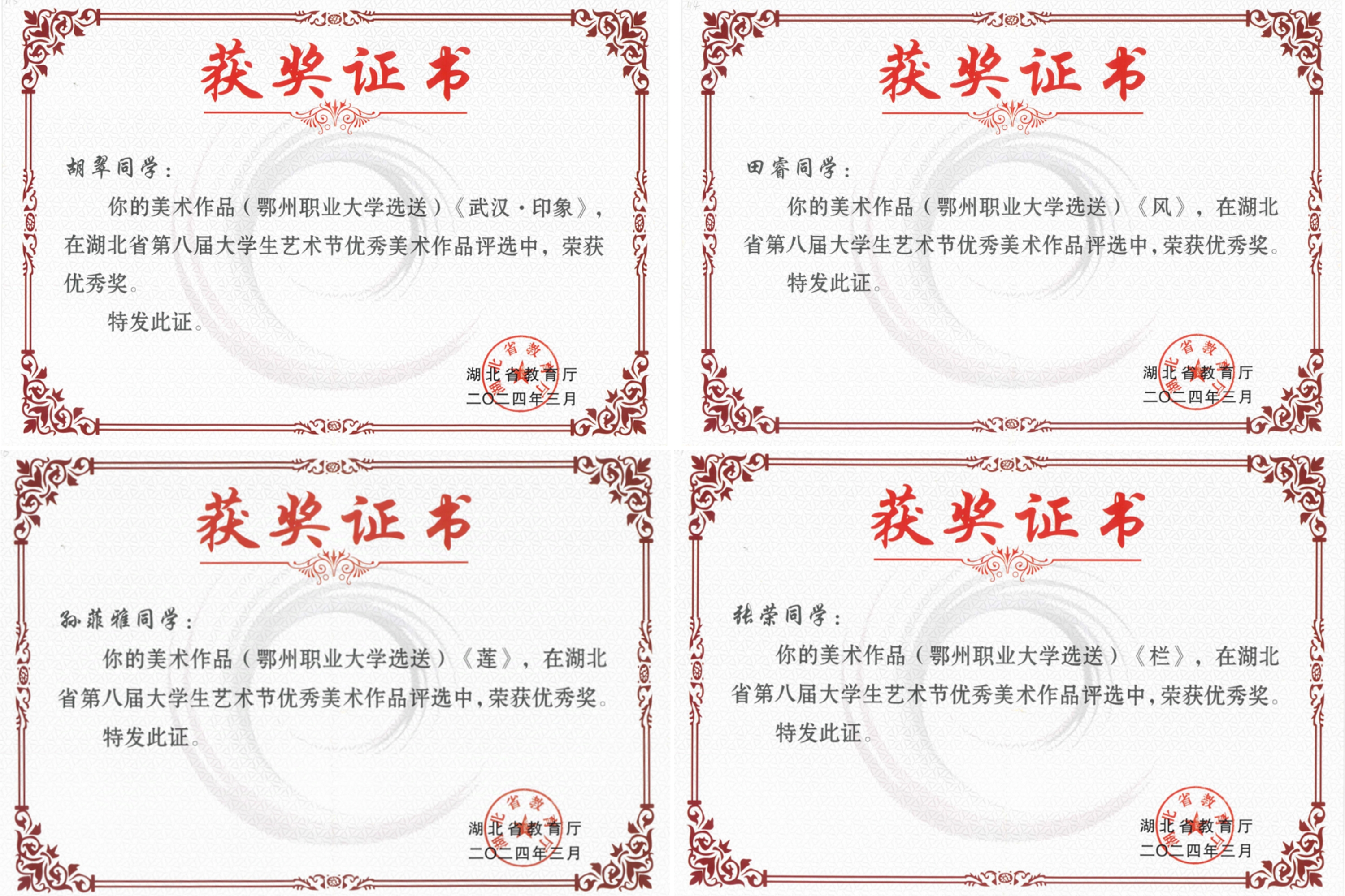 此外,张荣同学的《栏》、孙菲雅同学的《莲》、胡翠同学的《武汉.印象》以及田睿同学的《风》均荣获优秀奖。这些作品题材多样,风格各异,从不同角度展现了同学们的艺术才华和对生活、对世界的独特理解与感悟。