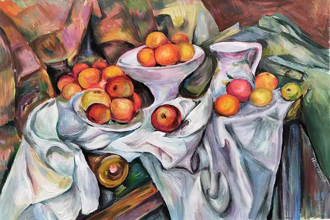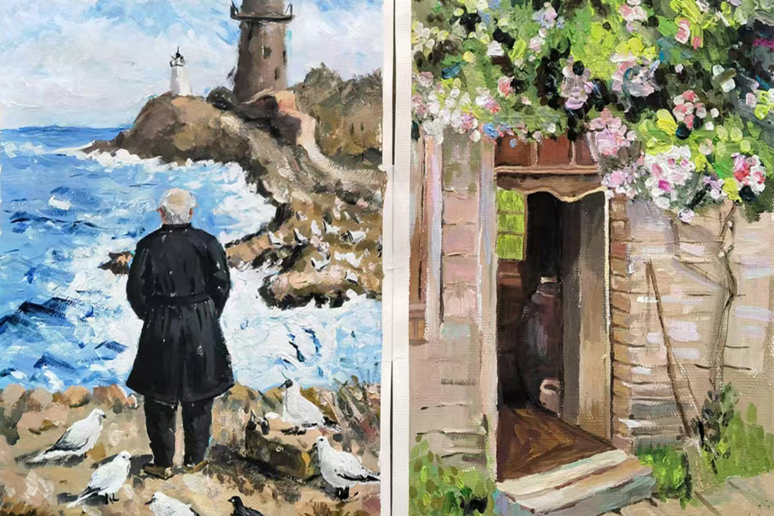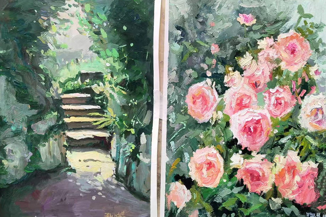 展览中,同学们的水粉画作品成为了主角,这些作品题材丰富多样,其中静物与风景题材尤为引人注目。一幅幅静物画宛如被施了魔法,平凡的物件在色彩的装点下焕发出别样的魅力,细腻的笔触勾勒出物体的轮廓,精准的色彩调配还原了真实的质感,光影的巧妙运用更是增添了画面的立体感与层次感。而风景画则仿佛是一扇扇通往各处美景的窗户,四季的更迭、自然的神韵皆在画布上得以呈现,从春日繁花似锦的绚烂到冬日银装素裹的静谧,从山川的雄伟壮丽到溪流的潺潺灵动,同学们用色彩诠释着对大自然的深刻理解与独特感悟,每一处色彩的交织都诉说着他们内心的情感与创意。