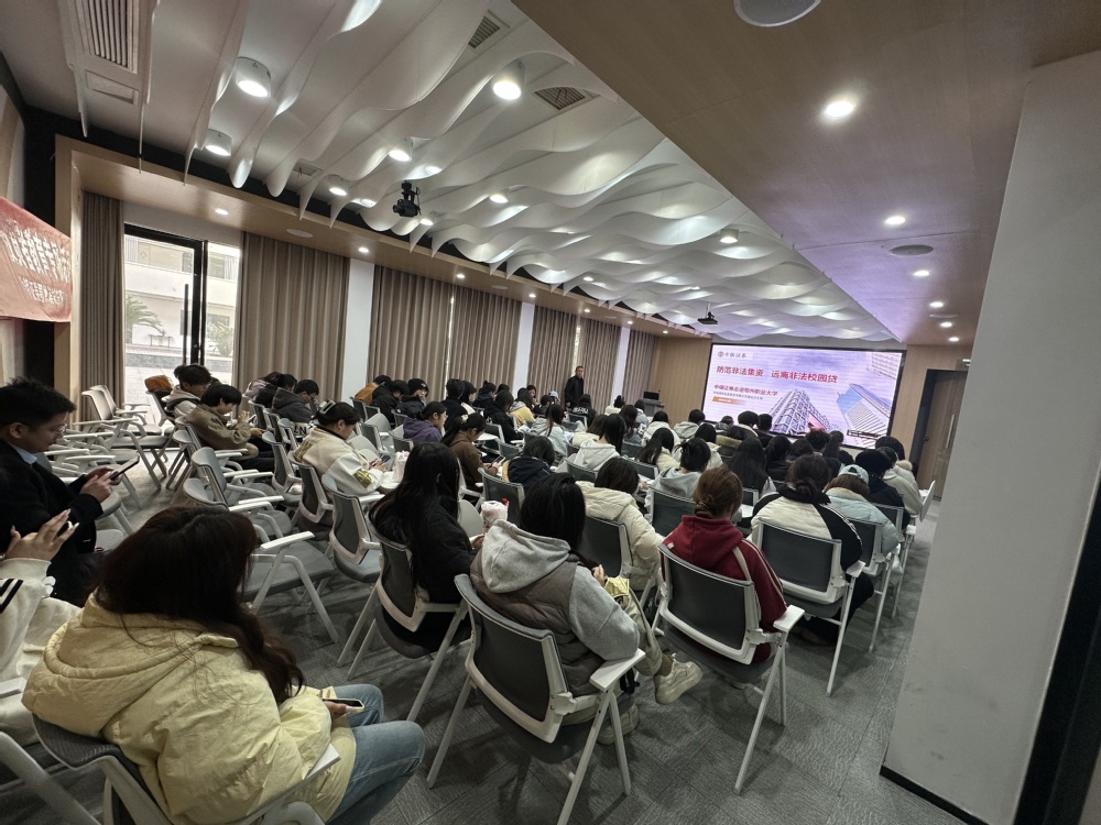 活动伊始,主讲人以“日常钱不够花怎么办”为切入点,迅速引发学生共鸣。结合《防范和处置非法集资条例》,主讲人清晰阐述了非法集资的法律界定——即未经国务院金融管理部门许可,以承诺回报为诱饵,向社会公众吸收资金的行为,并强调仅有银行等持牌机构具备吸收公众存款资格。通过剖析“非法性、公开性、利诱性、社会性”四大特征,揭露了高额返利、虚假项目、名人站台等常见诈骗手法,并结合具体数据警示:单位非法集资对象超150人或金额超100万元、个人对象超30人或金额超20万元,即可能构成犯罪。大学生王某因参与非法集资并动员亲友投入464.5万元而最终担责的真实案例,令在场学子深刻认识到,即便被动参与也可能面临严重法律后果。