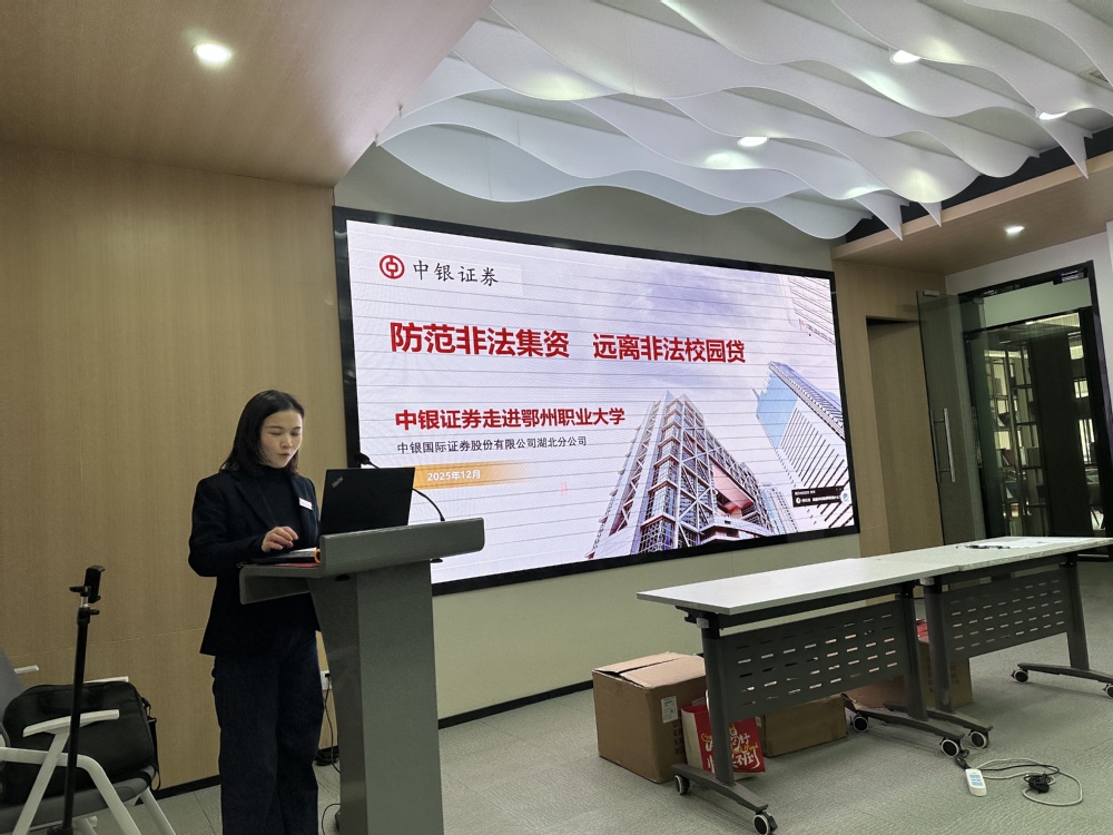 (通讯员 柯希茜 程一玲)为积极响应中国证监会“投教进百校”倡议,切实增强高校学生金融风险防范意识与自我保护能力,11月27日下午,中银国际证券有限公司湖北分公司走进鄂州职业大学艺术学院“一站式”学生社区举办了一场主题鲜明的金融安全科普活动,聚焦防范非法集资、识别不良校园贷及普及反洗钱知识,为学生送上实用“防骗指南”。
