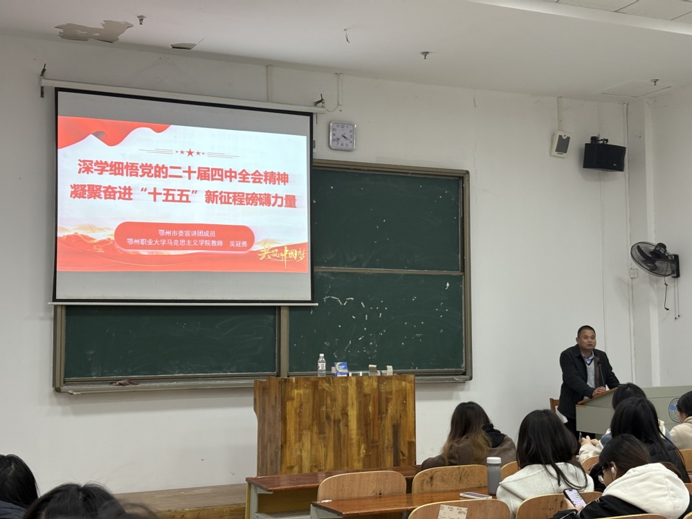 通讯员 柯希茜 程一玲为引导艺术学院师生深入学习领会党的二十届四中全会精神,凝聚投身“十五五”新征程的奋进力量,1211,鄂州职业大学艺术学院邀请鄂州市委宣讲团成员、校马克思主义学院教师吴冠勇,走进艺术学院“一站式”学生社区,为社区学生开展主题宣讲活动。