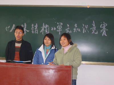 为了提高学生对学习的兴趣及学风的建设,医学院基础教研室根据学校及学院精神,于11月5日至20日期间,对07级护理专业学生,以《人体结构学》为重点,进行了知识单元竞赛,其方式以理论答卷和抽题答辩进行,评定出个人及集体一、二、三等名次,并对其进行精神和物质奖励,促进学习兴趣。