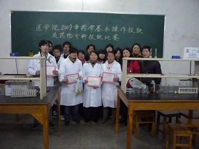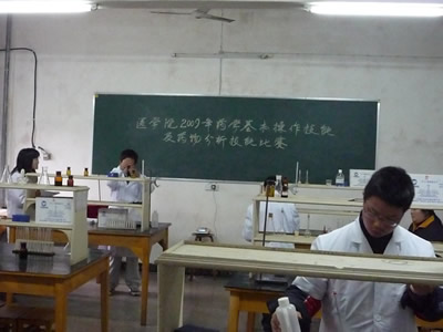2009年12月16,我院08药学专业学生在医学院基础化学实验室举行了药学专业基本技能及药物分析技术竞赛,比赛分笔试和操作两部分。11月20日,12位同学通过第一轮笔试,进入第二轮复赛。12月16日,在医学院基础化学实验室,通过对维生素片有效成分含量的测定等基本操作对学生进行了考核,蔡正海等六位同学分获一、二、三等奖。