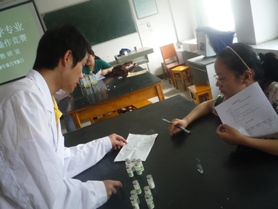 2010年5月19日下午3点,药学专业在医学院药理实验室举办了“药物调剂操作综合技能” 比赛。参赛人员有:药学教研室老师和08级药学专业的阮明月等学生参加。