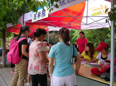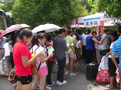 【本网讯 张文报道 艾淑君摄影】2011年9月3日我院于校图书馆广场正式拉开2011级新生入学接待工作的序幕。医学院党总支汪艳霞书记亲自挂帅,带领辅导员、班主任和学生干部组成团队,我院秦自荣院长多次亲临现场慰问师生并指导迎新工作。连续3天紧张繁重的迎新工作,师生们始终以饱满的热情不辞辛苦坚守在工作岗位上。通过师生们的共同努力,圆满的完成了我院2011级一千一百多名新生的入学接待工作并深受学生家长的一致好评。