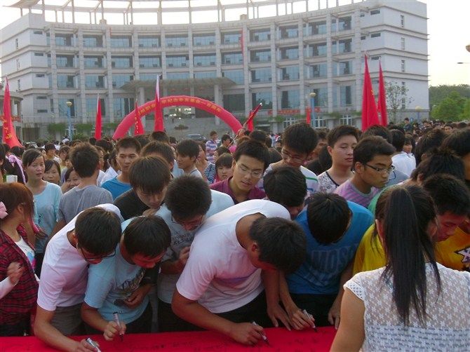 签名仪式伊始校长田巨平发表热情洋溢的讲话,他强调同学们要继承和发扬辛亥革命前辈们敢于创新,克难奋进的精神,勇于开拓未来。11级新生许乐代表全体同学发言表示将缅怀先烈,将辛亥革命精神发扬光大。随后校领导带领全体同学在十余米长的横幅上郑重的写下自己的姓名,党委书记杨植涛宣布此次万人签名活动圆满结束。