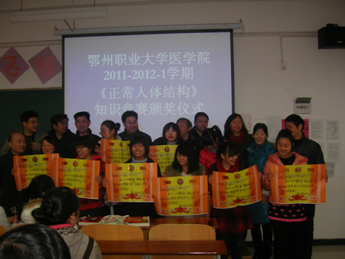 为了激发学生的学习热情,提高学生的理论知识水平和动手能力,以“巩固知识、强化本领”为宗旨,我校于2011年12月10日上午8:30~12:00在新教学楼隆重举行了“2011级护理、助产、涉外专业《正常人体结构》”的决赛。此次比赛由医学院基础教研室承办,经过教研室认真筹备策划后,决赛阶段分基础理论、实践技能两个阶段,总计20个班参与活动。比赛过程中选手们自信沉稳、活动严肃但不缺乏活泼,最后颁奖场面热烈。