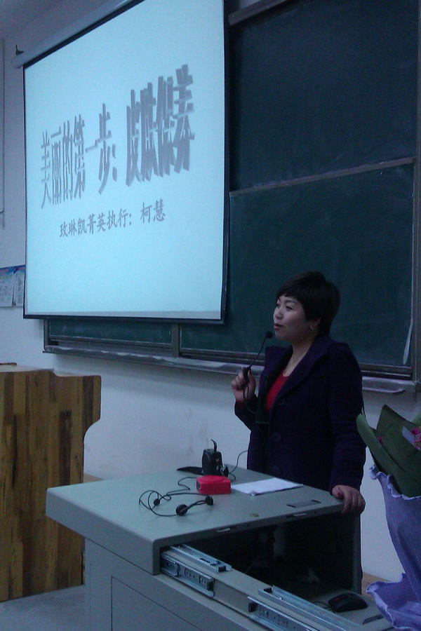 讲座中柯慧老师凭借多年从事美容化妆及形象设计专业经验从多方面阐述女性职业化妆和皮肤美容保健的知识,强调护士职业女性必须内外兼修,并且为现场同学进行面部美容化妆展示。