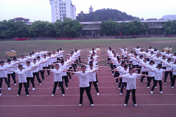 4月11日下午2:00校田径场彩旗招展、口号嘹亮,为响应我校争创活动的号召推广全民健身运动,医学院组织80余名同学参加我校首届广播体操比赛。