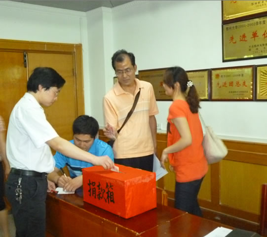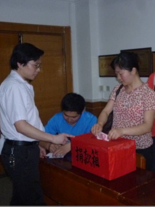 2012年5月16日下午,在学院领导的关心和号召下,我院全体教师发起了向本院身患白血病的吴芳同学献爱心捐款活动。大家纷纷伸出了援助之手,慷慨解囊,奉献出了自己的一份爱心。你五十他一百,带着全院教师的爱心与祝福纷纷投进了募捐箱。