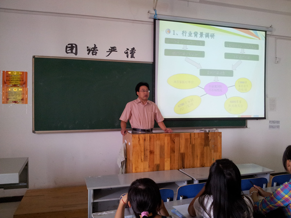 2012年9月24日下午,鄂州职业大学医学院院长杨家林副教授来到主教学楼E503为同学们做了题为“医药营销,成就未来梦想”的学术讲座。参加讲座老师周先云副教授、医药营销教研室主任鲁昌盛、戢丹菊、辅导员洪运良及2012级新生总100多人。