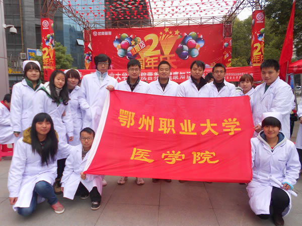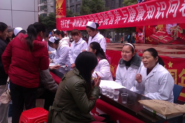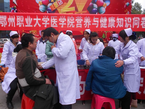 本次活动在鄂州市盛世君安药业有限公司的大力协助下,在武商量贩凤凰店门前开展免费健康体检和营养健康问卷调查活动。我院守护天使协会的同学们在老师的指导下发放营养健康调查问卷,开展免费血压测量、血糖监测和推拿按摩,我院内外妇儿专业的教师为过往行人免费咨询各种健康问题。健康服务点前社区居民和行人络绎不绝,同学们熟练的操作和老师们细致的解答赢得社区群众的一致好评。活动中共发放健康调查问卷500份、健康咨询100人次,免费血糖测量70余人。