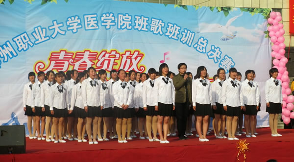 为贯彻党的“十八大”精神,营造良好校园文化氛围,进一步深化班级文化建设,提升学生的团队意识,促进良好班风和学风的形成。2012年12月7日下午,我院第三届班歌班训比赛在主教学楼前隆重举行。鄂州职业大学副校长饶浩洲、学工处处长马凌军、校团委书记范国珍、医学院院长杨家林、医学院党总支书记汪艳霞等主要领导莅临本次活动并担任评委,2012级全体师生1170人参与本次活动。