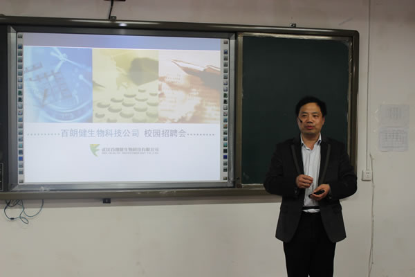 2013年4月16日下午,武汉百朗健生物科技有限公司在我院弘德楼阶梯一教室举行了专场招聘会,此次招聘会主要面向药学和医药营销专业学生。公司人力资源部负责人凌女士首先就该公司机构概况、事业发展、品牌业务、拟招聘计划等作了介绍,并告诉同学们,大学生要培养吃苦精神,以积极开放的心态面对将要从事的工作,把工作当成一种奋斗的乐趣,不断拼搏,才可能有好的事业成就。她还鼓励各应聘学生为自己的人生添加砝码,并表示公司将会积极支持所聘学生的发展深造。