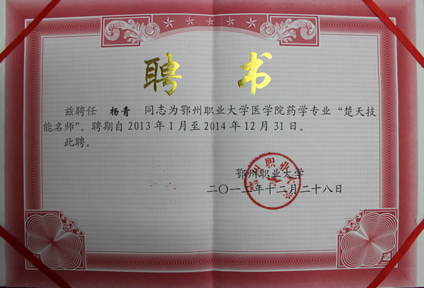根据《湖北省高等职业院校楚天技能名师教学岗位制度实施办法》的要求,我院药学专业聘任武汉百朗健生物科技有限公司创始人兼总经理杨青为医学院药学专业楚天技能名师,聘期2年。